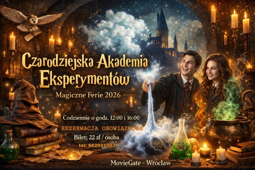 W te ferie zimowe podziemia MovieGate we Wrocławiu zamienią się w pełną tajemnic Czarodziejską Akademię Eksperymentów, gdzie nauka spotka się z magią! Czy marzyliście kiedyś, aby poczuć się jak młody czarodziej lub czarownica uczestniczący w lekcjach magii? Przygotujcie się na niesamowite widowisko inspirowane światem szkół magii — pokaz eksperymentów, które wyglądają jak prawdziwe zaklęcia: chmury i...